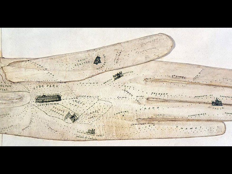 The landmarks of Victorian London painted onto a glove - designed by George Shove for the London’s Great Exhibition in Hyde Park, 1851